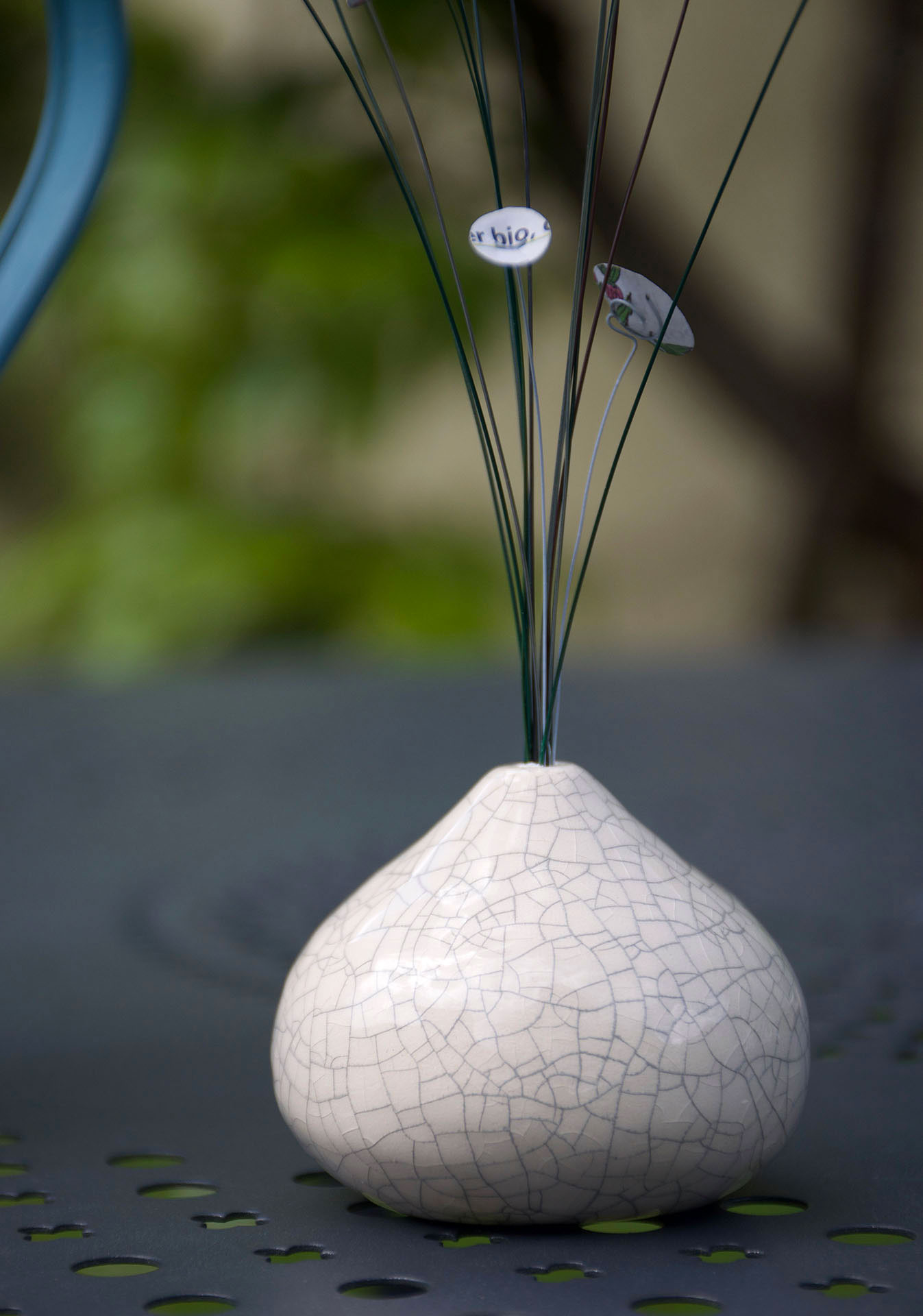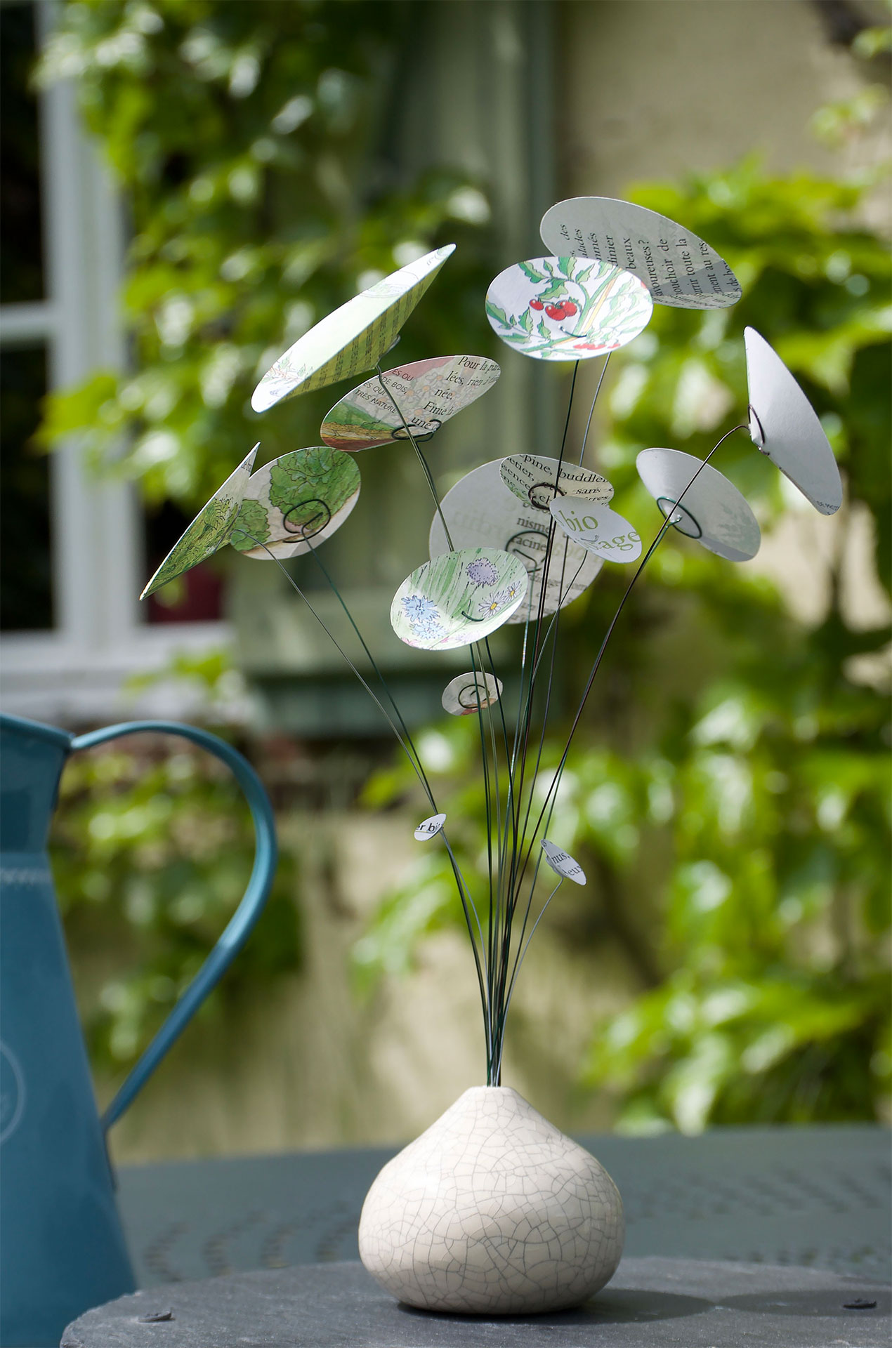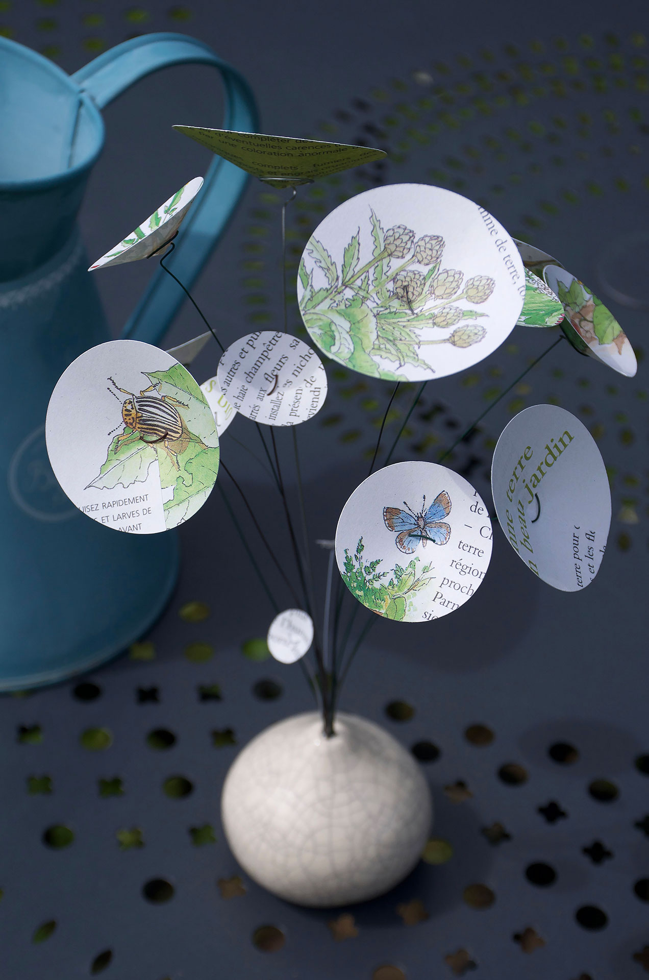 Dans ce Papier Jardin, vous trouverez, poussant d’un socle original en raku, des pétales de libellules, un arrosoir bleu, de grandes marguerites, des tomates cerises, des potirons, des artichauts et des papillons, entre autres.