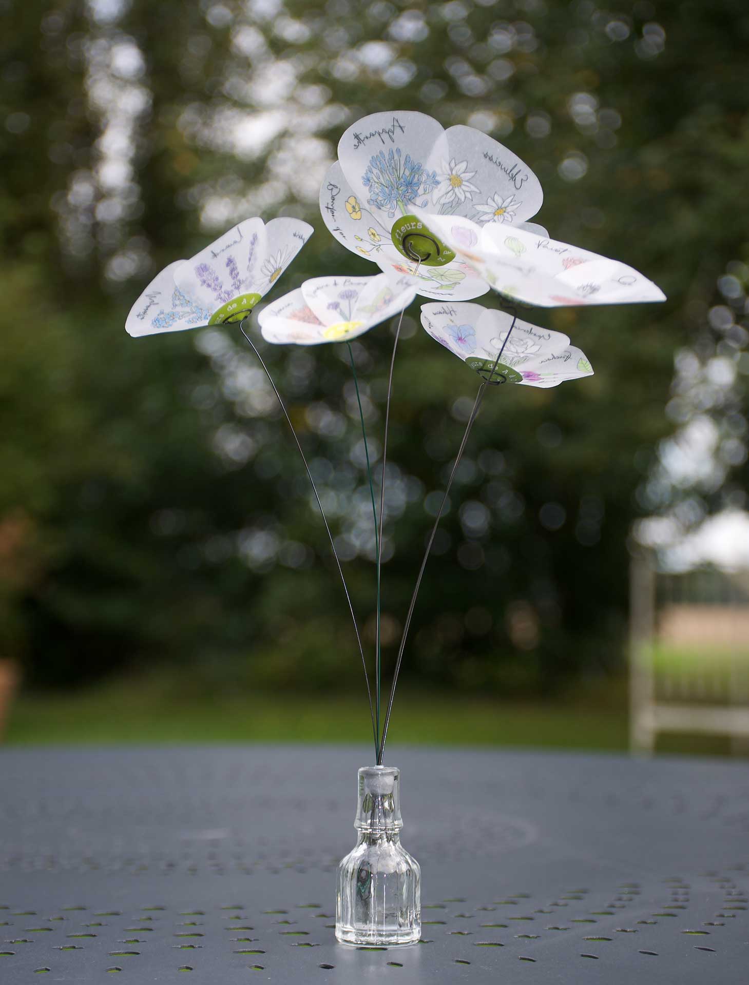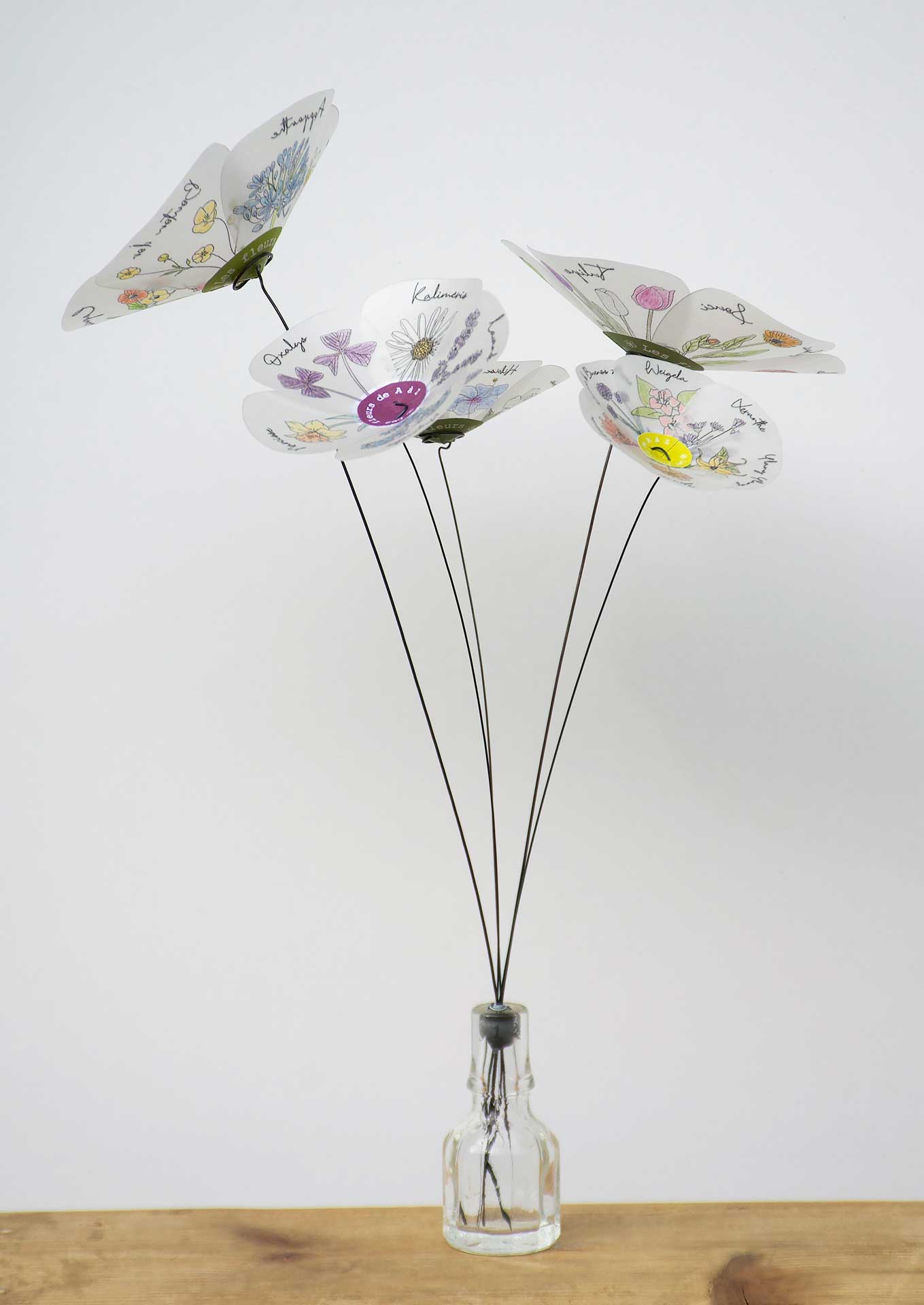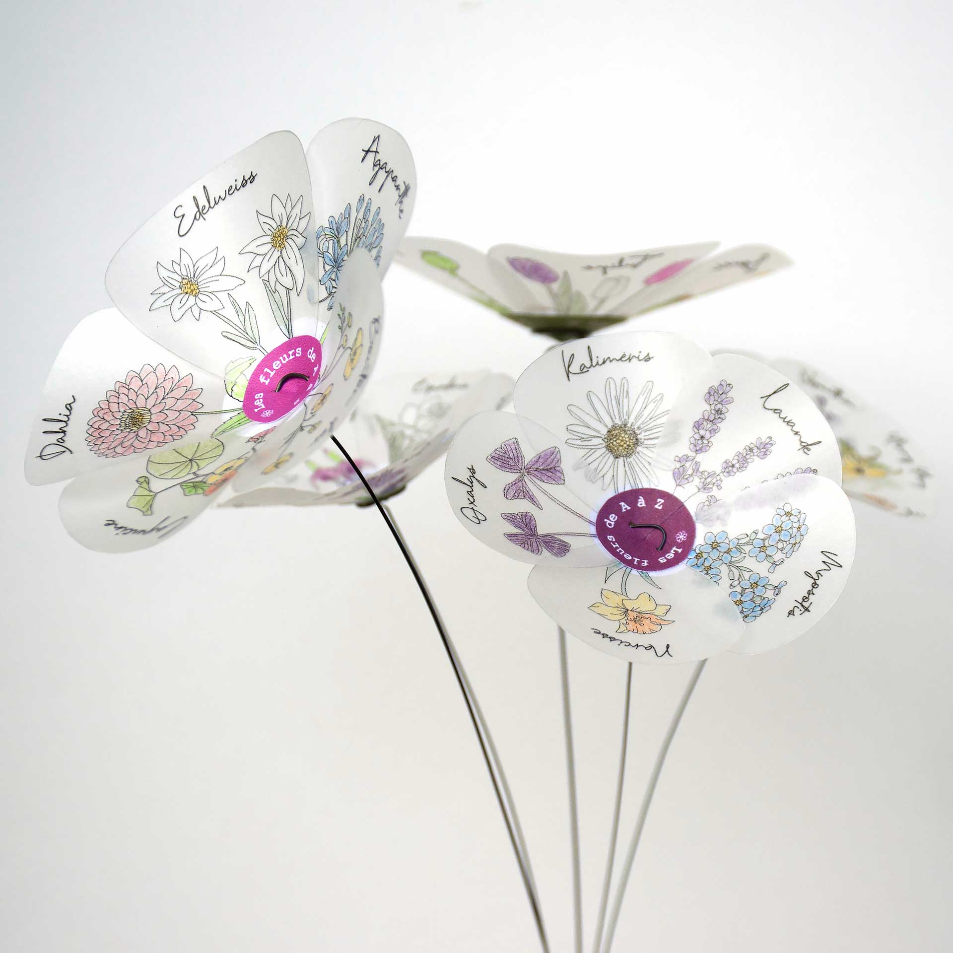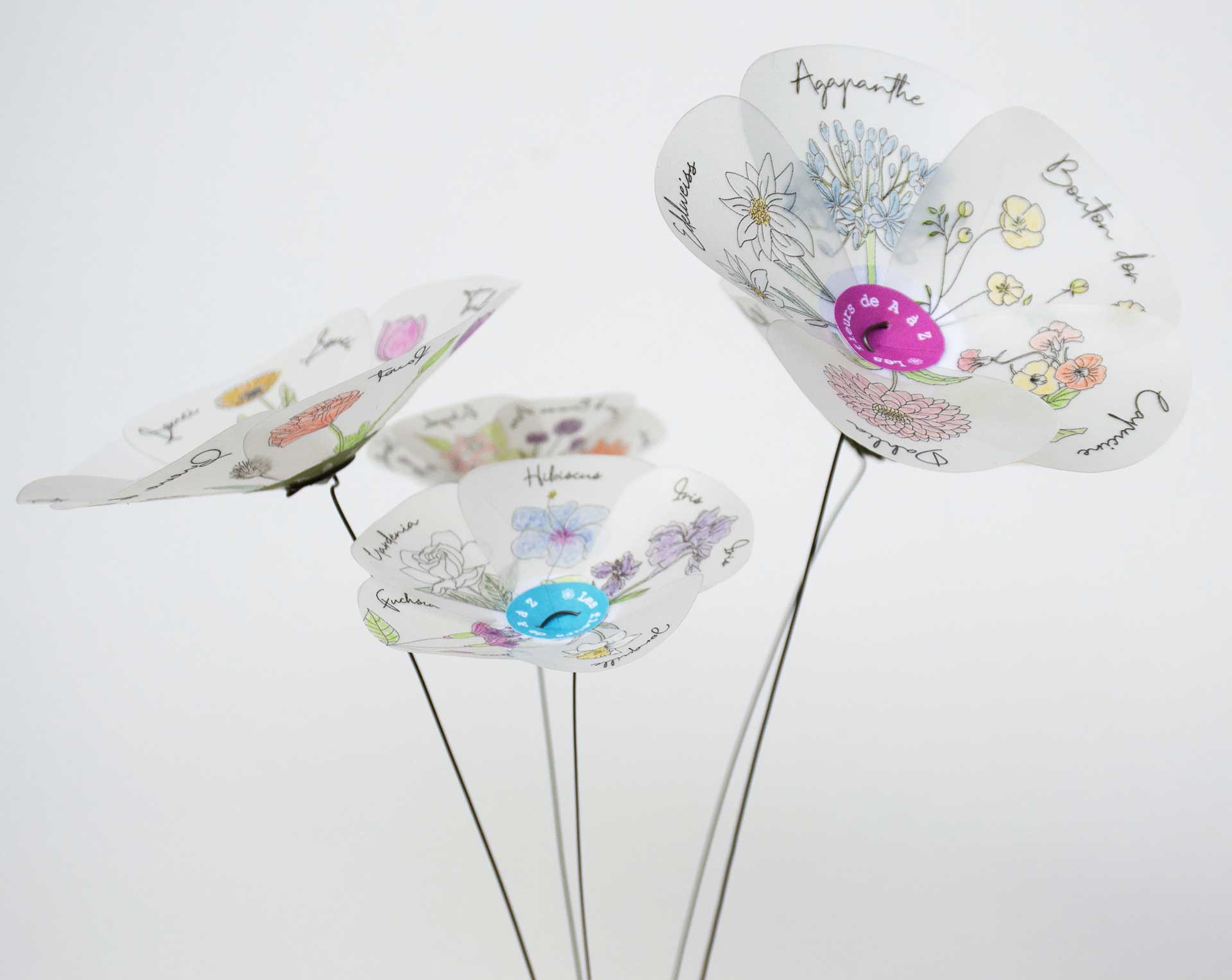 C’est un bouquet bien particulier fait de 5 fleurs de taille différente dont chaque pétale est orné du dessin et du nom d’une fleur, de A à Z.