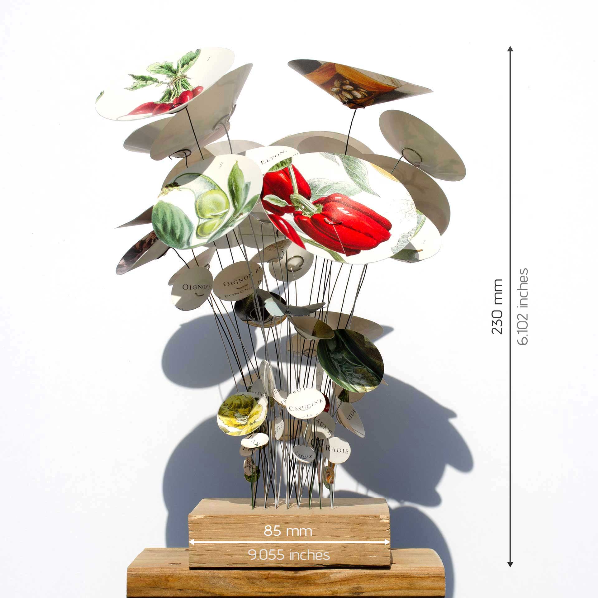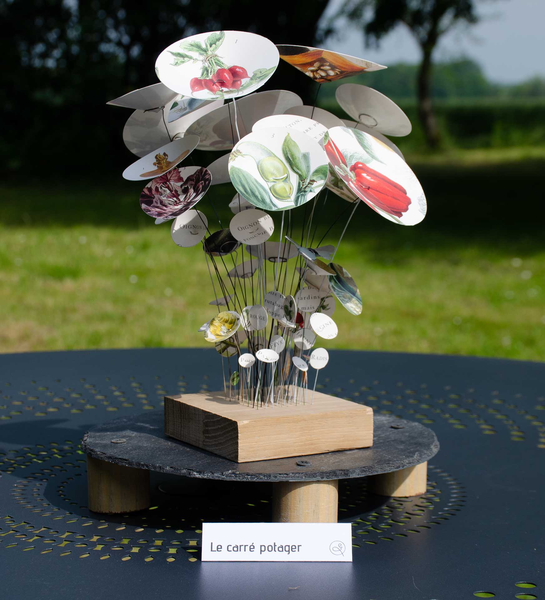C’est un carré potager luxuriant, où les oignons rouges et blancs, les poivrons, les radis, les betteraves, les haricots, le maïs, les piments, les mini-carottes mais aussi les fraises ou les capucines se cultivent ensemble en harmonie, comme un jardin de curé. Et si vous regardez bien, un papillon en origami s’y promène avec délectation !