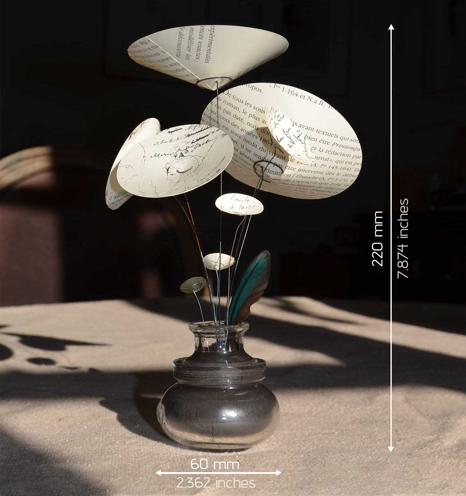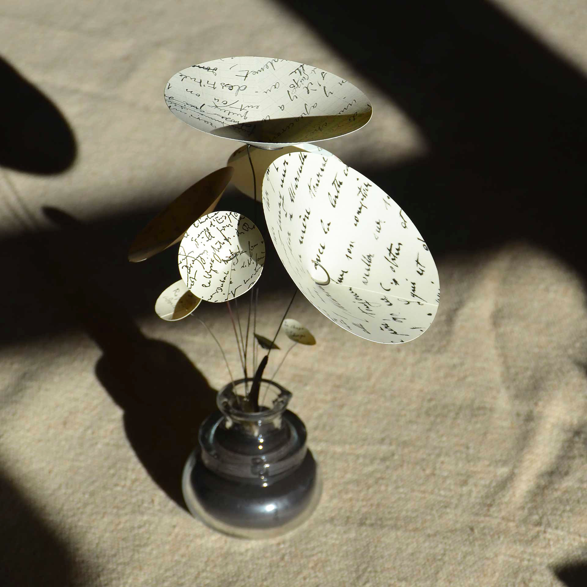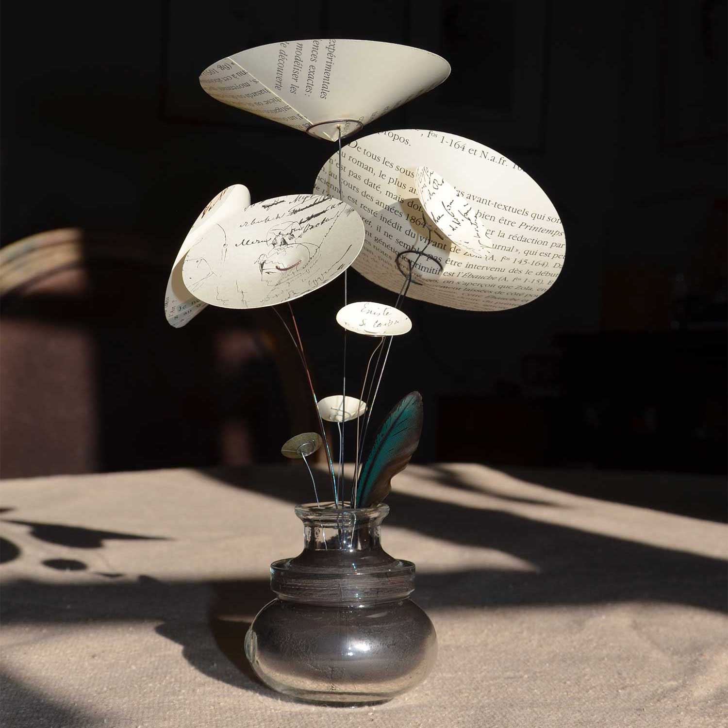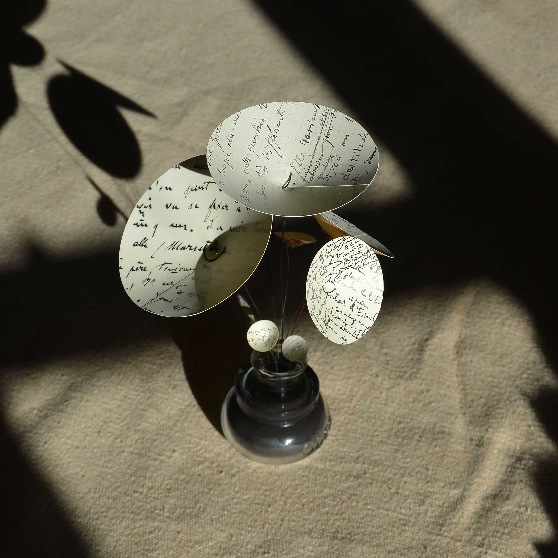 D’un socle en verre, comme un encrier, s’échappent des pétales de textes manuscrits de poètes et d’écrivains célèbres.