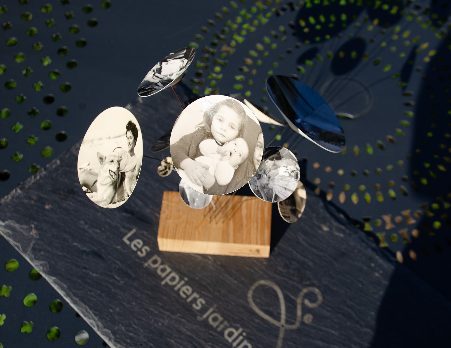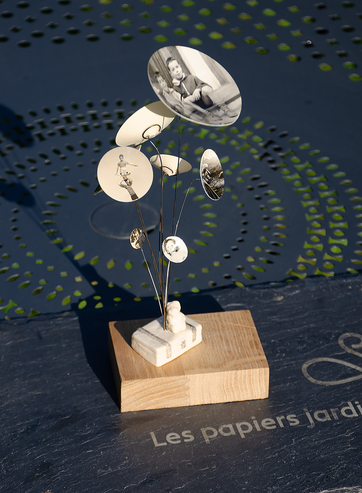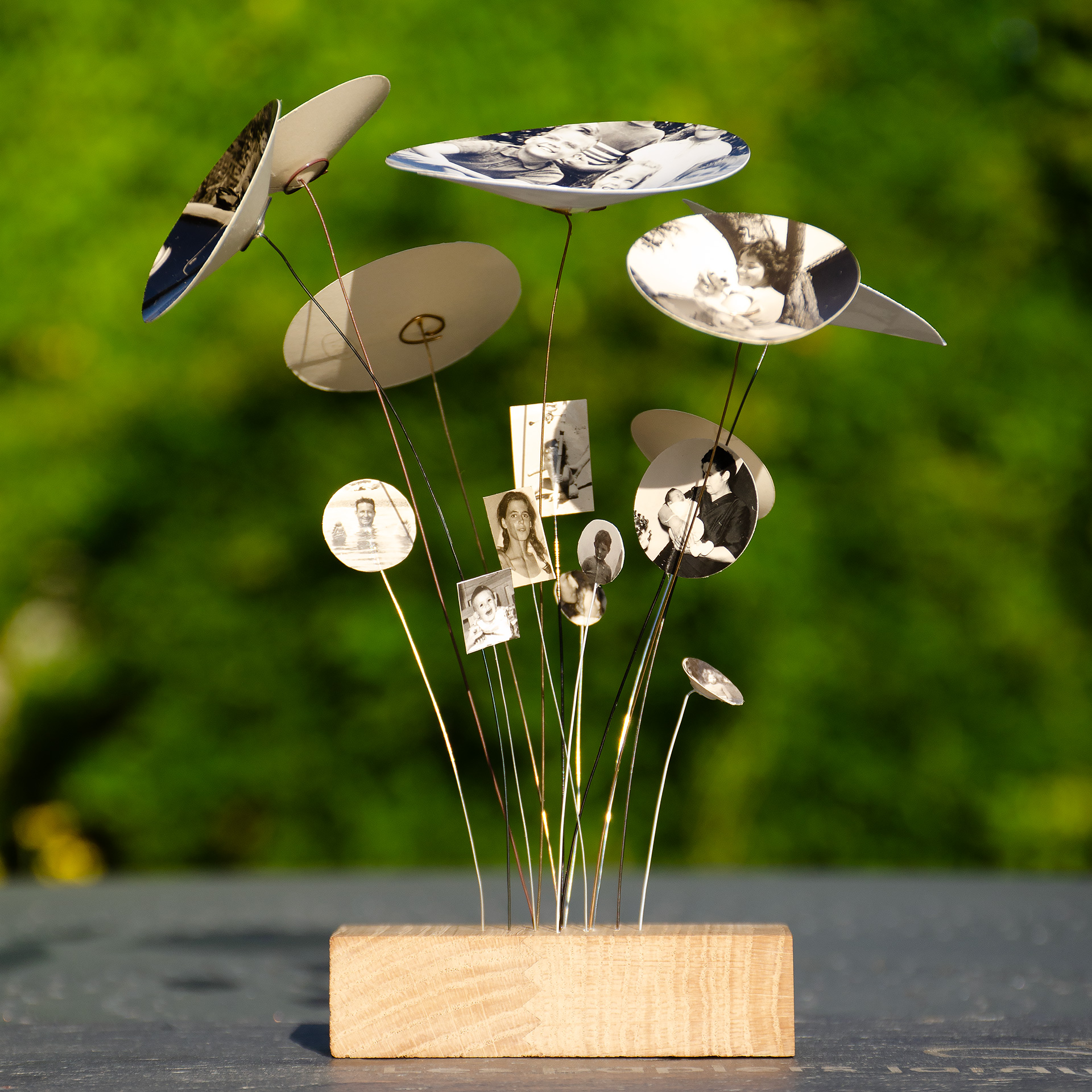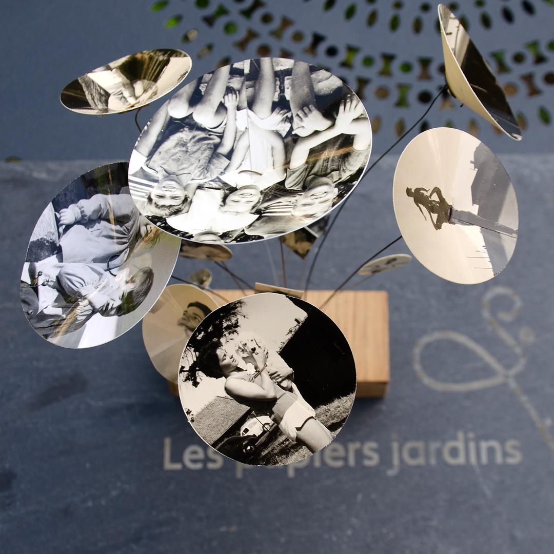 Le jardin des souvenirs, c’est l’évocation de l’enfance. Sur de vraies photos anciennes réapparaissent les cousins, cousines, les jolies tantes dans les années 60, la mamie portant un bébé, un oncle à son mariage, tatie Tounette et son chien en vacances, la plage… Tous ces jours heureux réunis ici en bouquet, pour une évocation éternelle de la Famille, sous nos yeux, tous les jours !